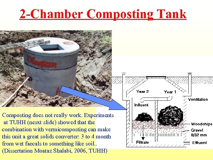 2 -Chamber Composting Tank Composting does not really work. Experiments at TUHH (nesxt slide) showed that the combination with vermicomposting can make this unit a great solids converter: 3 to 4 month from wet faecals to something like soil. . (Dissertation Moataz Shalabi, 2006, TUHH)