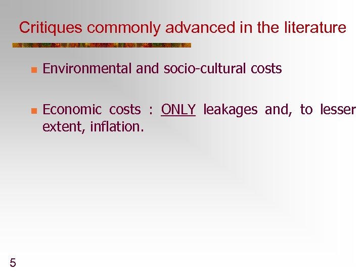Critiques commonly advanced in the literature n n 5 Environmental and socio-cultural costs Economic costs : ONLY leakages and, to lesser extent, inflation.