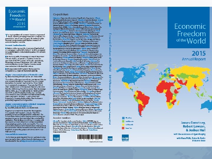 What is the Economic Freedom of the World Index? § An annual compilation of data representing factors which make a country economically free § Authors: James Gwartney, Robert Lawson, and Joshua Hall § A compendium of 42 government policies affecting economic freedom based on objective data or independent surveys § A ranking of 156 countries plus Hong Kong, representing 95% of the world’s population, according to the extent to which they permit their citizens to be economically free § Now a collaboration of Institutes in 90 nations and territories