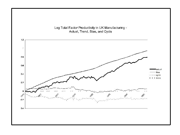 slowdown in the ’ 70 s, speedup in the ’ 80 s • In common with most other OECD economies, manufacturing TFP growth in the UK slowed in the 1970 s (from about 2½ per cent per annum in the 1960 s to about 0. 2 per cent per annum between 1973 and 1979). • UK manufacturing TFP experienced an increase in growth in the 1980 s, attaining a growth rate of about 3 per cent per annum. • Two possible explanations for the slowdown and speedup: • Mismeasurement: Capital Scrapping; Labour Hoarding; Single Deflation Bias. • Structural Change: Institutional Rigidities and Strong Unions in the 1970 s followed in the 1980 s by weakening of trade union power, withdrawal of state-subsidies, shedding of below average plants, increased subcontracting and catch-up to international best practice, along with foreign direct investment.