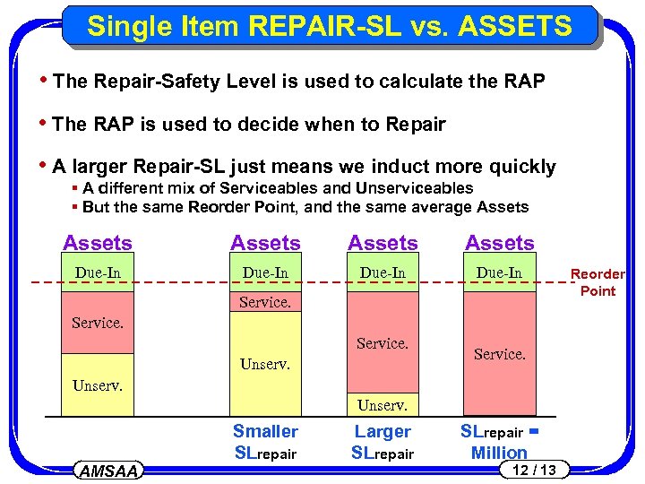 Single Item REPAIR-SL vs. ASSETS • The Repair-Safety Level is used to calculate the RAP • The RAP is used to decide when to Repair • A larger Repair-SL just means we induct more quickly § A different mix of Serviceables and Unserviceables § But the same Reorder Point, and the same average Assets Assets Due-In Service. Unserv. Service. Unserv. AMSAA Smaller SLrepair Larger SLrepair = Million 12 / 13 Reorder Point