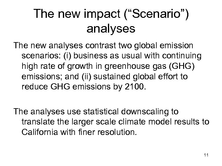 The new impact (“Scenario”) analyses The new analyses contrast two global emission scenarios: (i) business as usual with continuing high rate of growth in greenhouse gas (GHG) emissions; and (ii) sustained global effort to reduce GHG emissions by 2100. The analyses use statistical downscaling to translate the larger scale climate model results to California with finer resolution. 11