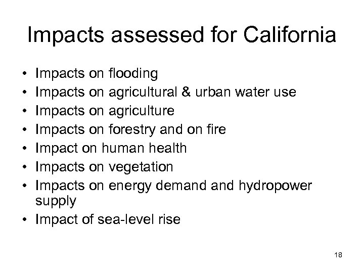 Impacts assessed for California • • Impacts on flooding Impacts on agricultural & urban water use Impacts on agriculture Impacts on forestry and on fire Impact on human health Impacts on vegetation Impacts on energy demand hydropower supply • Impact of sea-level rise 18