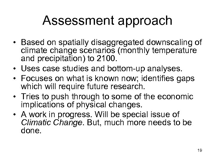 Assessment approach • Based on spatially disaggregated downscaling of climate change scenarios (monthly temperature and precipitation) to 2100. • Uses case studies and bottom-up analyses. • Focuses on what is known now; identifies gaps which will require future research. • Tries to push through to some of the economic implications of physical changes. • A work in progress. Will be special issue of Climatic Change. But, much more needs to be done. 19