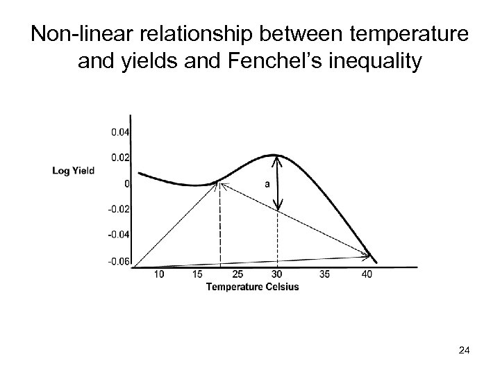 Schlenker & Roberts (2006) Relation of Temperature and Crop Yield • Relationship is not symmetrical; it is distinctly asymmetric, fairly flat at first and then sharply declining beyond an upper threshold. 23