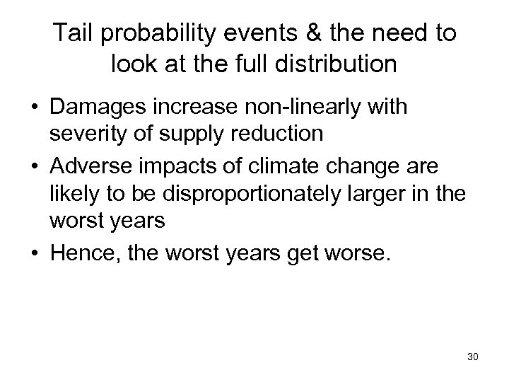 Tail probability events & the need to look at the full distribution • Damages increase non-linearly with severity of supply reduction • Adverse impacts of climate change are likely to be disproportionately larger in the worst years • Hence, the worst years get worse. 30