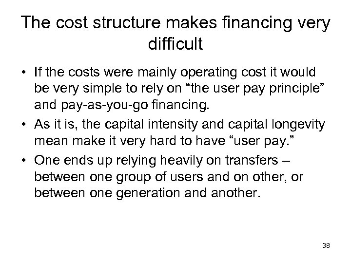 The cost structure makes financing very difficult • If the costs were mainly operating cost it would be very simple to rely on “the user pay principle” and pay-as-you-go financing. • As it is, the capital intensity and capital longevity mean make it very hard to have “user pay. ” • One ends up relying heavily on transfers – between one group of users and on other, or between one generation and another. 38