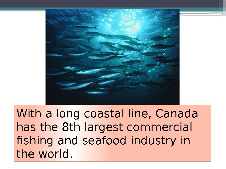 With a long coastal line, Canada has the 8 th largest commercial fishing and seafood industry in the world.