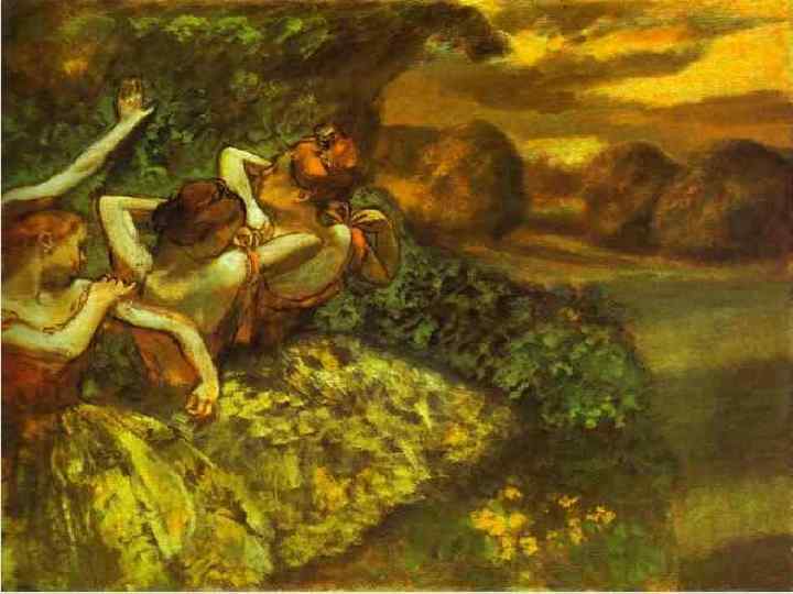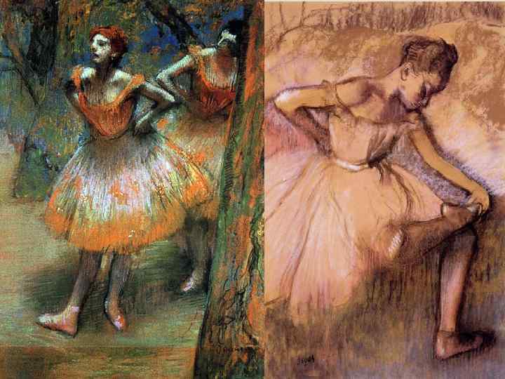 Произведения, посвящённые балетной теме Работы художника можно разделить на несколько тематических направлений, одним из которых, снискавшим популярность у публики, стало изображение балетных сцен, преподносимое им с изяществом, но без лишней сентиментальности. Если работы его предшественников, на которых звёзды балета изображались в классических, но лишённых жизни позах, более всего походили на обложки журналов, то танцовщицы Дега выглядели ярко и непринуждённо, создавая ощущение живой грации. Среди наиболее известных работ этого цикла ― «Танцевальный класс» (1873 г. ), «Танцовщица на сцене» (1879 г. ), «Танцовщицы на репетиции» (1879 г. ) и «Голубые танцовщицы» (1890 г. ).