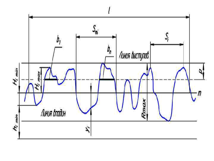 — базовая длина; — средняя линия профиля; — средний шаг неровностей профиля; — средний шаг местных выступов профиля; Himax — отклонение пяти наибольших максимумов профиля; Himin — отклонение пяти наибольших минимумов профиля; himax — расстояние от высших точек пяти наибольших максимумов до линии параллельной средней и не пересекающей профиль; — расстояние от низших точек пяти наибольших минимумов до линии параллельной средней и не пересекающей профиль; Rmax — наибольшая высота профиля; yi — отклонения профиля от линии m ; p — уровень сечения профиля; — длина отрезков, отсекаемых на уровне p.
