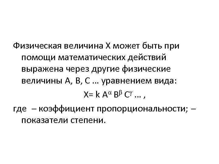 Физическая величина Х может быть при помощи математических действий выражена через другие физические величины А, В, С … уравнением вида: Х= k А В С … , где коэффициент пропорциональности; показатели степени.