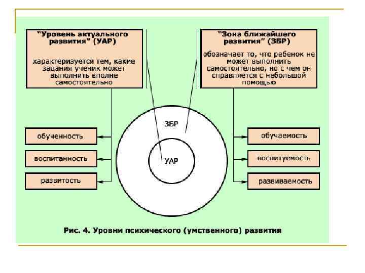 Уровни умственного развития (по Л. С. Выготскому) n n Актуального развития - наличный уровень подготовленности (задачи которые ученик может выполнить самостоятельно) Зона ближайшего развития - достигается ребенком в сотрудничестве со взрослым или в совместной деятельности со сверстниками, не путем прямого подражания его действиям, а решением задач, находящихся в зоне его интеллектуальных возможностей.