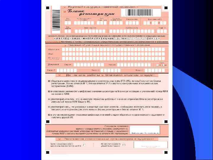 l Информация, внесенная в бланки ЕГЭ (бланк регистрации, бланк ответов № 1 и верхняя часть бланка ответов № 2), сканируется и распознается ЭВМ без участия человека. l Все бланки ЕГЭ заполняются только яркими черными чернилами. Допускается использование только гелевой или капиллярной ручек.