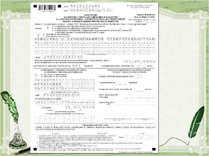 СНЯТИЕ С УЧЕТА Осуществляется на основании заявления, представленного в налоговый орган в течение пяти дней со дня прекращения деятельности. Датой снятия с учета считается указанная в заявлении дата прекращения деятельности. Налоговый орган в течение пяти дней со дня получения от налогоплательщика заявления о снятии с учета направляет ему уведомление о снятии его с учета.