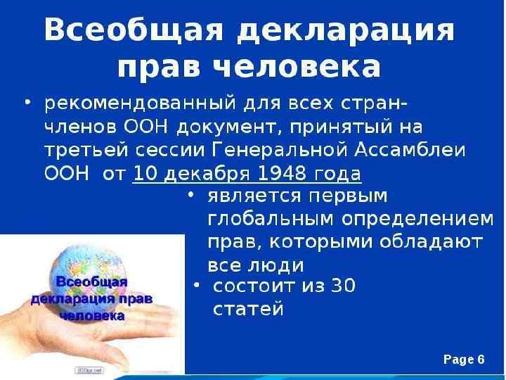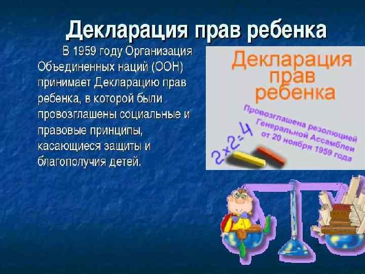 Международно-правовые акты по правам человека: 1945 г. – Устав ООН поправам человека. 10 декабря 1948 года третьей на Ассамблее ООН была принята Всеобщая декларация прав человека. 1989 г. Конвенция ООН о правах ребенка. 1993 г. Конституция России. -