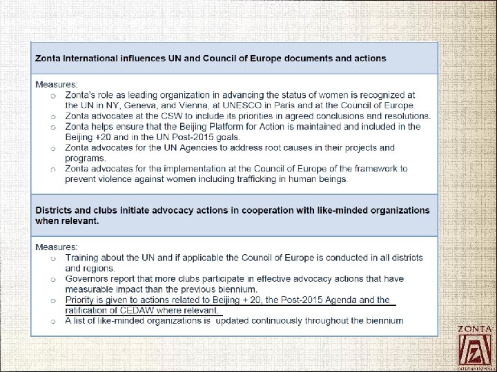 Plan an Advocacy Campaign • Know your issue • Establish your objectives • Examine interests of all stakeholders • Develop a strategy • Have the initiative approved by your District Governor and Advocacy Chairman • Identify & mobilize required resources • Use advocacy tools/guidance on Zonta. org website • Follow ZI Bylaws, Advocacy & Affiliation policies • Implement strategy; monitor progress