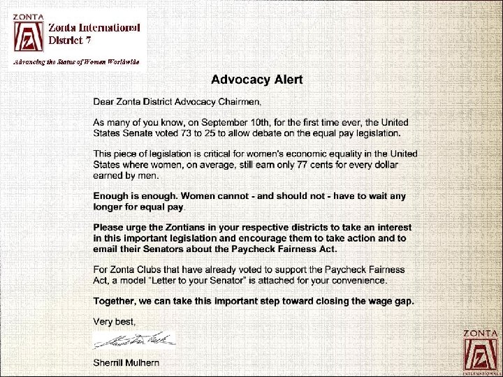 Advocate for what? District 7 Advocacy Platform Whereas, Zonta International District 7 seeks to advance the status of women through timely communications of clearly-stated positions, and Whereas, there is agreement that the following issues are of common concern to all members of the District: • Achieving pay equity S. 84: Paycheck Fairness Act • Ensuring equal rights under the law Ratification : ERA, CEDAW • Women in Scientific, Social & Political Leadership S. 288: Women and Minorities in STEM Booster Act of 2013 • Supporting measures to oppose gender-based violence, such as trafficking, rape, & domestic violence, H. R. 6087: International Protecting Girls by Preventing Child Marriage Act of 2012