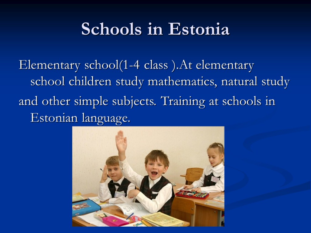 Schools in Estonia Elementary school(1-4 class ).At elementary school children study mathematics, natural study and other simple subjects. Training at schools in Estonian language.
