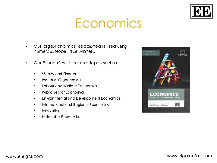 Economics • Our largest and most established list, featuring numerous Nobel Prize winners. • Our Economics list includes topics such as: • Money and Finance • Industrial Organisation • Labour and Welfare Economics • Public Sector Economics • Environmental and Development Economics • International and Regional Economics • Innovation • Heterodox Economics www. e-elgar. com www. elgaronline. com