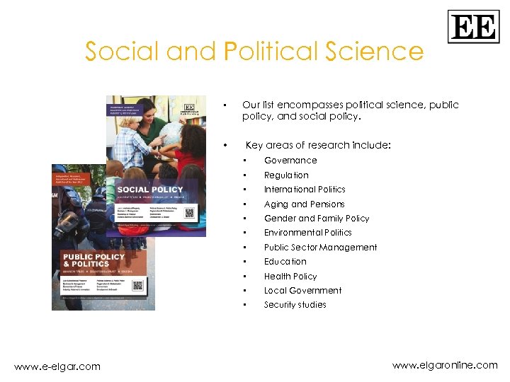 Social and Political Science • • Our list encompasses political science, public policy, and social policy. Key areas of research include: • • Regulation • International Politics • Aging and Pensions • Gender and Family Policy • Environmental Politics • Public Sector Management • Education • Health Policy • Local Government • www. e-elgar. com Governance Security studies www. elgaronline. com