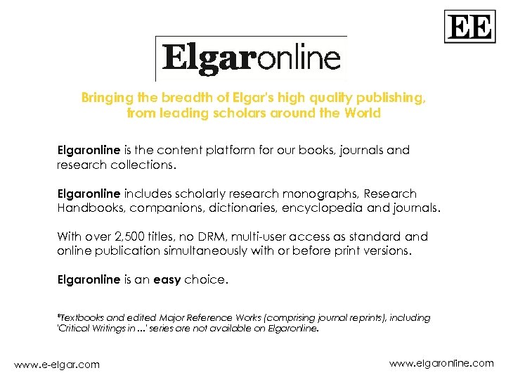 Bringing the breadth of Elgar's high quality publishing, from leading scholars around the World Elgaronline is the content platform for our books, journals and research collections. Elgaronline includes scholarly research monographs, Research Handbooks, companions, dictionaries, encyclopedia and journals. With over 2, 500 titles, no DRM, multi-user access as standard and online publication simultaneously with or before print versions. Elgaronline is an easy choice. *Textbooks and edited Major Reference Works (comprising journal reprints), including 'Critical Writings in. . . ' series are not available on Elgaronline. www. e-elgar. com www. elgaronline. com