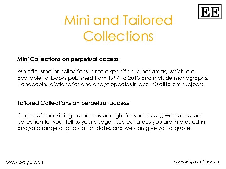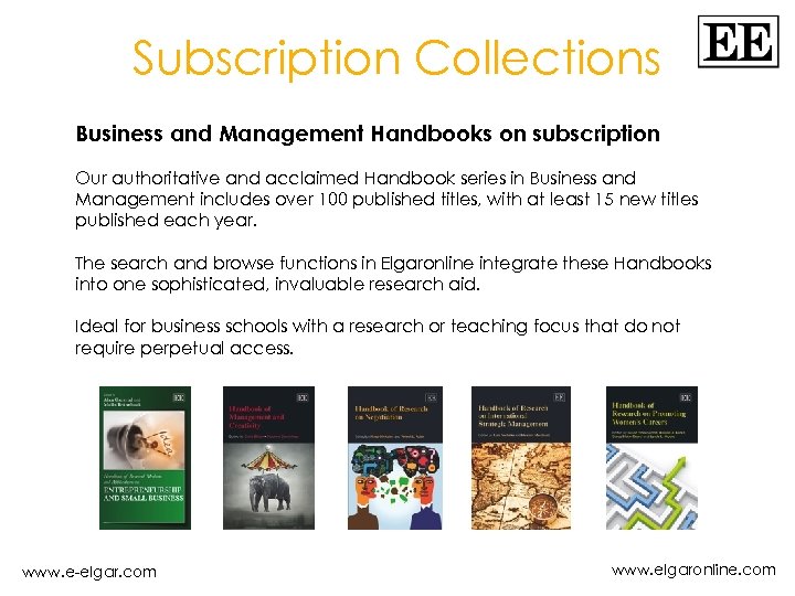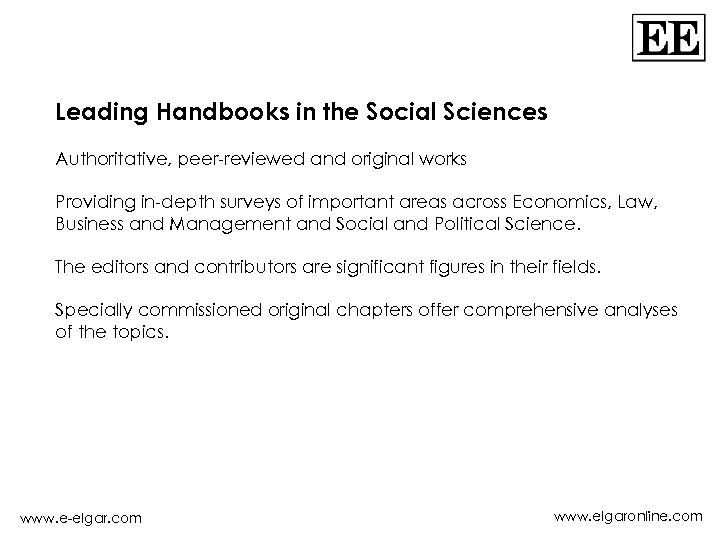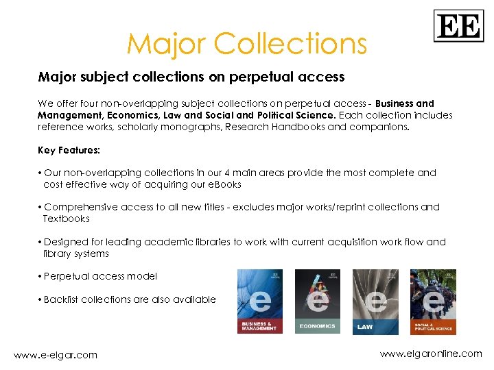 Major Collections Major subject collections on perpetual access We offer four non-overlapping subject collections on perpetual access - Business and Management, Economics, Law and Social and Political Science. Each collection includes reference works, scholarly monographs, Research Handbooks and companions. Key Features: • Our non-overlapping collections in our 4 main areas provide the most complete and cost effective way of acquiring our e. Books • Comprehensive access to all new titles - excludes major works/reprint collections and Textbooks • Designed for leading academic libraries to work with current acquisition work flow and library systems • Perpetual access model • Backlist collections are also available www. e-elgar. com www. elgaronline. com