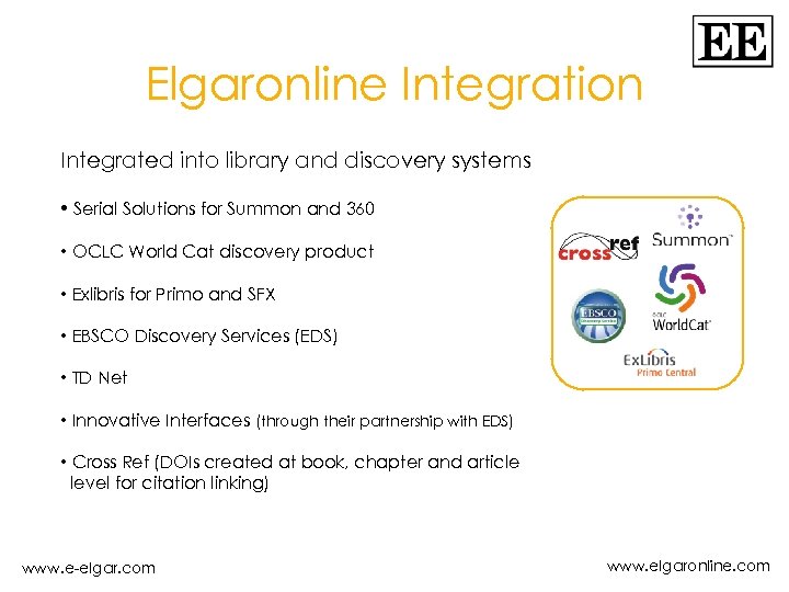 Elgaronline Integration Integrated into library and discovery systems • Serial Solutions for Summon and 360 • OCLC World Cat discovery product • Exlibris for Primo and SFX • EBSCO Discovery Services (EDS) • TD Net • Innovative Interfaces (through their partnership with EDS) • Cross Ref (DOIs created at book, chapter and article level for citation linking) www. e-elgar. com www. elgaronline. com
