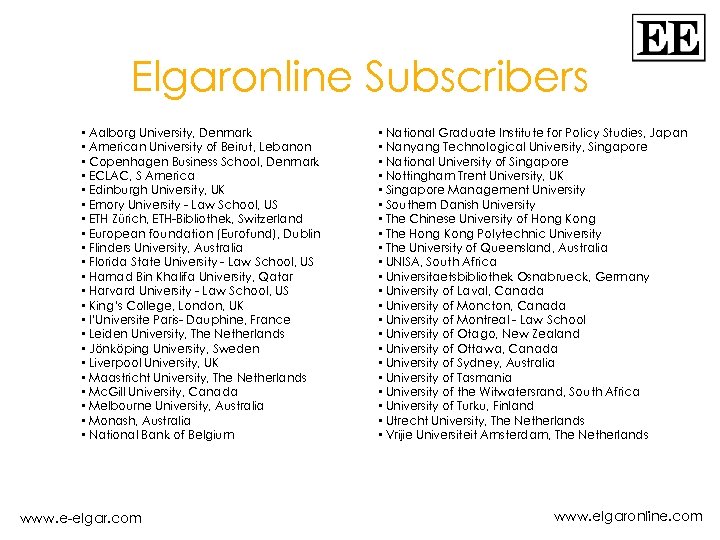 Elgaronline Subscribers • Aalborg University, Denmark • American University of Beirut, Lebanon • Copenhagen Business School, Denmark • ECLAC, S America • Edinburgh University, UK • Emory University - Law School, US • ETH Zürich, ETH-Bibliothek, Switzerland • European foundation (Eurofund), Dublin • Flinders University, Australia • Florida State University - Law School, US • Hamad Bin Khalifa University, Qatar • Harvard University - Law School, US • King’s College, London, UK • l’Universite Paris- Dauphine, France • Leiden University, The Netherlands • Jönköping University, Sweden • Liverpool University, UK • Maastricht University, The Netherlands • Mc. Gill University, Canada • Melbourne University, Australia • Monash, Australia • National Bank of Belgium www. e-elgar. com • National Graduate Institute for Policy Studies, Japan • Nanyang Technological University, Singapore • National University of Singapore • Nottingham Trent University, UK • Singapore Management University • Southern Danish University • The Chinese University of Hong Kong • The Hong Kong Polytechnic University • The University of Queensland, Australia • UNISA, South Africa • Universitaetsbibliothek Osnabrueck, Germany • University of Laval, Canada • University of Moncton, Canada • University of Montreal - Law School • University of Otago, New Zealand • University of Ottawa, Canada • University of Sydney, Australia • University of Tasmania • University of the Witwatersrand, South Africa • University of Turku, Finland • Utrecht University, The Netherlands • Vrijie Universiteit Amsterdam, The Netherlands www. elgaronline. com