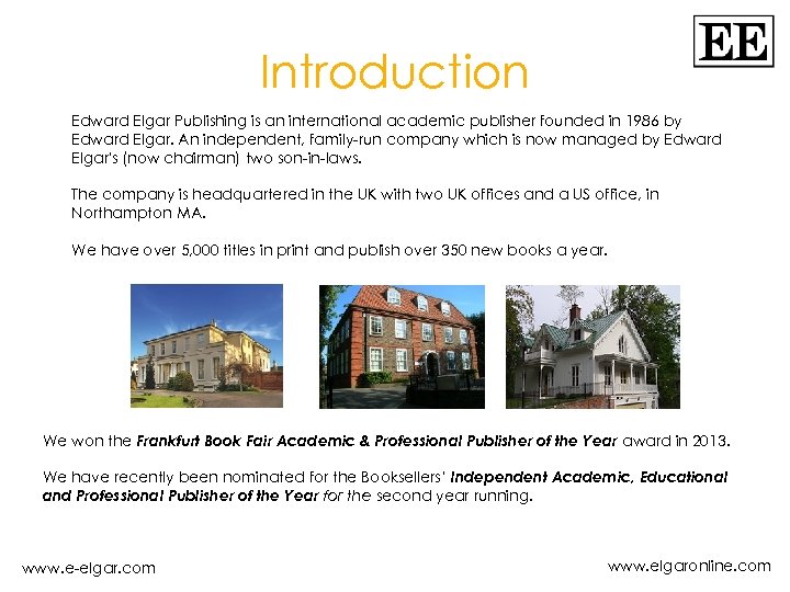 Introduction Edward Elgar Publishing is an international academic publisher founded in 1986 by Edward Elgar. An independent, family-run company which is now managed by Edward Elgar's (now chairman) two son-in-laws. The company is headquartered in the UK with two UK offices and a US office, in Northampton MA. We have over 5, 000 titles in print and publish over 350 new books a year. We won the Frankfurt Book Fair Academic & Professional Publisher of the Year award in 2013. We have recently been nominated for the Booksellers’ Independent Academic, Educational and Professional Publisher of the Year for the second year running. www. e-elgar. com www. elgaronline. com