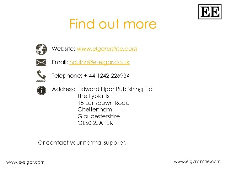 Find out more Website: www. elgaronline. com Email: hquinn@e-elgar. co. uk Telephone: + 44 1242 226934 Address: Edward Elgar Publishing Ltd The Lypiatts 15 Lansdown Road Cheltenham Gloucestershire GL 50 2 JA UK Or contact your normal supplier. www. e-elgar. com www. elgaronline. com