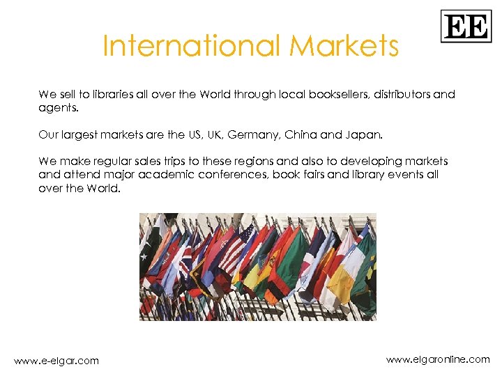 International Markets We sell to libraries all over the World through local booksellers, distributors and agents. Our largest markets are the US, UK, Germany, China and Japan. We make regular sales trips to these regions and also to developing markets and attend major academic conferences, book fairs and library events all over the World. www. e-elgar. com www. elgaronline. com