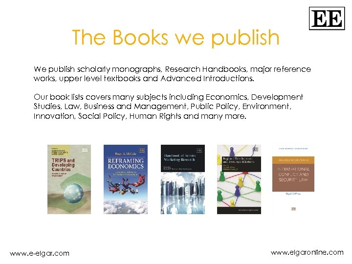 The Books we publish We publish scholarly monographs, Research Handbooks, major reference works, upper level textbooks and Advanced Introductions. Our book lists covers many subjects including Economics, Development Studies, Law, Business and Management, Public Policy, Environment, Innovation, Social Policy, Human Rights and many more. www. e-elgar. com www. elgaronline. com