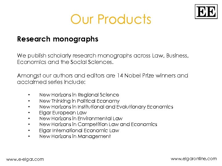 Our Products Research monographs We publish scholarly research monographs across Law, Business, Economics and the Social Sciences. Amongst our authors and editors are 14 Nobel Prize winners and acclaimed series include: • • New Horizons in Regional Science New Thinking in Political Economy New Horizons in Institutional and Evolutionary Economics Elgar European Law New Horizons in Environmental Law New Horizons in Competition Law and Economics Elgar International Economic Law New Horizons in Management www. e-elgar. com www. elgaronline. com