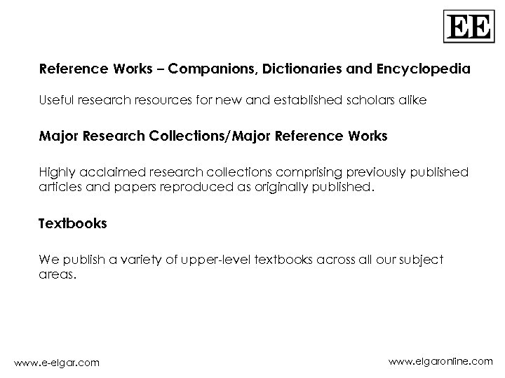 Reference Works – Companions, Dictionaries and Encyclopedia Useful research resources for new and established scholars alike Major Research Collections/Major Reference Works Highly acclaimed research collections comprising previously published articles and papers reproduced as originally published. Textbooks We publish a variety of upper-level textbooks across all our subject areas. www. e-elgar. com www. elgaronline. com