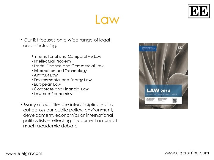 Law • Our list focuses on a wide range of legal areas including: • International and Comparative Law • Intellectual Property • Trade, Finance and Commercial Law • Information and Technology • Antitrust Law • Environmental and Energy Law • European Law • Corporate and Financial Law • Law and Economics • Many of our titles are interdisciplinary and cut across our public policy, environment, development, economics or international politics lists – reflecting the current nature of much academic debate www. e-elgar. com www. elgaronline. com