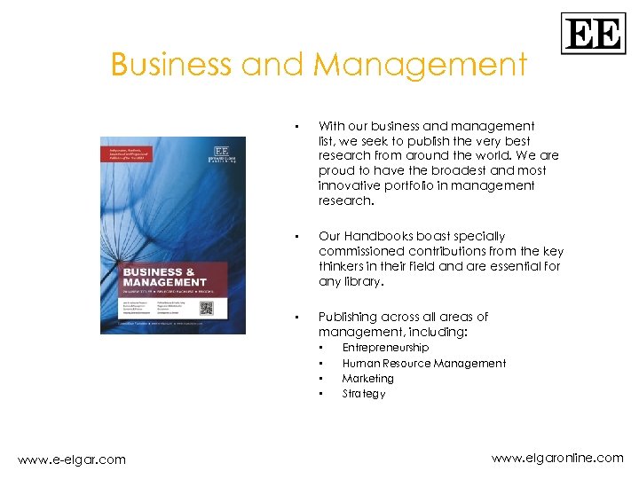 Business and Management • With our business and management list, we seek to publish the very best research from around the world. We are proud to have the broadest and most innovative portfolio in management research. • Our Handbooks boast specially commissioned contributions from the key thinkers in their field and are essential for any library. • Publishing across all areas of management, including: • • www. e-elgar. com Entrepreneurship Human Resource Management Marketing Strategy www. elgaronline. com
