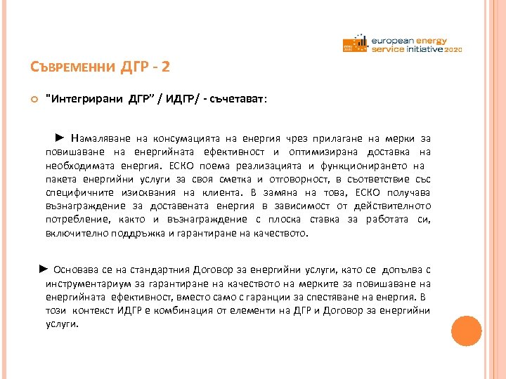 СЪВРЕМЕННИ ДГР - 2 "Интегрирани ДГР” / ИДГР/ - съчетават: ► Намаляване на консумацията на енергия чрез прилагане на мерки за повишаване на енергийната ефективност и оптимизирана доставка на необходимата енергия. ЕСКО поема реализацията и функционирането на пакета енергийни услуги за своя сметка и отговорност, в съответствие със специфичните изисквания на клиента. В замяна на това, ЕСКО получава възнаграждение за доставената енергия в зависимост от действителното потребление, както и възнаграждение с плоска ставка за работата си, включително поддръжка и гарантиране на качеството. ► Основава се на стандартния Договор за енергийни услуги, като се допълва с инструментариум за гарантиране на качеството на мерките за повишаване на енергийната ефективност, вместо само с гаранции за спестяване на енергия. В този контекст ИДГР е комбинация от елементи на ДГР и Договор за енергийни услуги.