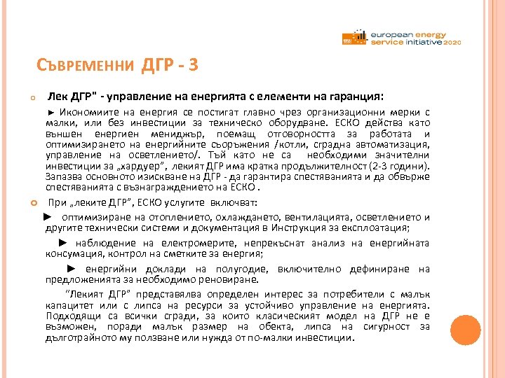 СЪВРЕМЕННИ ДГР - 3 Лек ДГР" - управление на енергията с елементи на гаранция: ► Икономиите на енергия се постигат главно чрез организационни мерки с малки, или без инвестиции за техническо оборудване. ЕСКО действа като външен енергиен мениджър, поемащ отговорността за работата и оптимизирането на енергийните съоръжения /котли, сградна автоматизация, управление на осветлението/. Тъй като не са необходими значителни инвестиции за „хардуер”, лекият ДГР има кратка продължителност (2 -3 години). Запазва основното изискване на ДГР - да гарантира спестяванията и да обвърже спестяванията с възнаграждението на ЕСКО. При „леките ДГР”, ЕСКО услугите включват: ► оптимизиране на отоплението, охлаждането, вентилацията, осветлението и другите технически системи и документация в Инструкция за експлоатация; ► наблюдение на електромерите, непрекъснат анализ на енергийната консумация, контрол на сметките за енергия; ► енергийни доклади на полугодие, включително дефиниране на предложенията за необходимо реновиране. “Лекият ДГР” представялва определен интерес за потребители с малък капацитет или с липса на ресурси за устойчиво управление на енергията. Подходящи са всички сгради, за които класическият модел на ДГР не е възможен, поради малък размер на обекта, липса на сигурност за дълготрайното му ползване или нужда от по-малки инвестиции.