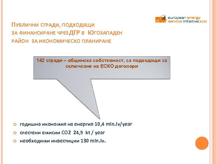 ПУБЛИЧНИ СГРАДИ, ПОДХОДЯЩИ ЗА ФИНАНСИРАНЕ ЧРЕЗ ДГР В ЮГОЗАПАДЕН РАЙОН ЗА ИКОНОМИЧЕСКО ПЛАНИРАНЕ 142 сгради – общинска собственост, са подходящи за сключване на ЕСКО договори годишна икономия на енергия 10, 4 mln. lv/year спестени емисии СО 2 24, 5 kt / year необходими инвестиции 130 mln. lv.