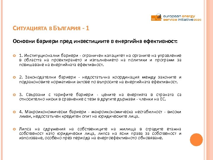 СИТУАЦИЯТА В БЪЛГАРИЯ - 1 Основни бариери пред инвестициите в енергийна ефективност: 1. Институционални бариери - ограничен капацитет на органите на управление в областта на проектирането и изпълнението на политики и програми за повишаване на енергийната ефективност. 2. Законодателни бариери - недостатъчна координация между законите и подзаконовите нормативни актове по въпросите на енергийната ефективност. 3. Свързани с тарифите бариери - цените на енергията в страната са относително ниски в сравнение с тези в другите държави - членки на ЕС. 4. Макроикономически бариери - макроикономическа нестабилност - високи лихви, недостатъчен кредитен опит на юридическите лица. Липса на сдружения на собствениците на жилища в сградите етажна собственост като юридически лица, липса на ясни права за собственост и използване, особено през периода на енергоефективното обновяване.