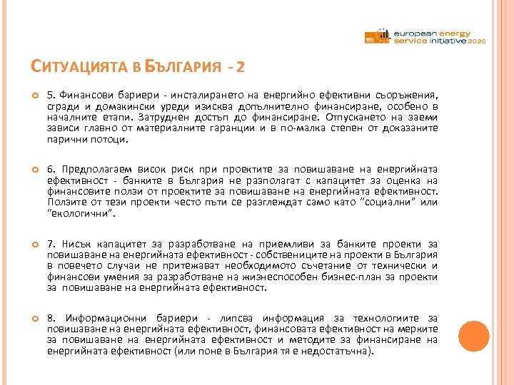 СИТУАЦИЯТА В БЪЛГАРИЯ - 2 5. Финансови бариери - инсталирането на енергийно ефективни съоръжения, сгради и домакински уреди изисква допълнително финансиране, особено в началните етапи. Затруднен достъп до финансиране. Отпускането на заеми зависи главно от материалните гаранции и в по-малка степен от доказаните парични потоци. 6. Предполагаем висок риск при проектите за повишаване на енергийната ефективност - банките в България не разполагат с капацитет за оценка на финансовите ползи от проектите за повишаване на енергийната ефективност. Ползите от тези проекти често пъти се разглеждат само като “социални” или “екологични”. 7. Нисък капацитет за разработване на приемливи за банките проекти за повишаване на енергийната ефективност - собствениците на проекти в България в повечето случаи не притежават необходимото съчетание от технически и финансови умения за разработване на жизнеспособен бизнес-план за проекти за повишаване на енергийната ефективност. 8. Информационни бариери - липсва информация за технологиите за повишаване на енергийната ефективност, финансовата ефективност на мерките за повишаване на енергийната ефективност и методите за финансиране на енергийната ефективност (или поне в България тя е недостатъчна).