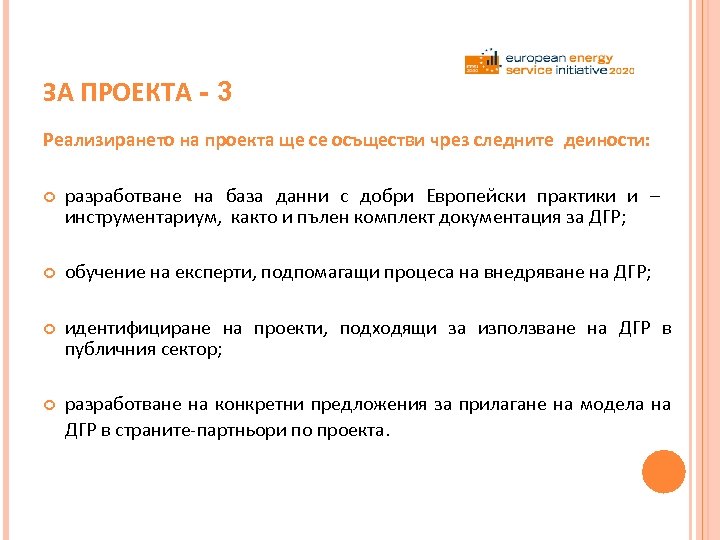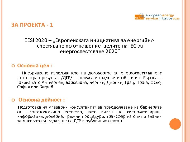 ЗА ПРОЕКТА - 1 EESI 2020 – „Европейската инициатива за енергийно спестяване по отношение целите на ЕС за енергоспестяване 2020“ Основна цел : Насърчаване използването на договорите за енергоспестяване с гарантиран резултат /ДГР/ в големите градове и области в Европа – такива като Антверпен, Барселона, Берлин, Дъблин, Грац, Прага, Осло, София или Загреб. Основна дейност : Подготовка на «пазарни консултанти» за преодоляване на бариерите от не-технологично естество, като липса на систематизирана информация, доверие, тръжни процедури, трансфер на опит и знания за масовото внедряване на ДГР в публичния сектор.
