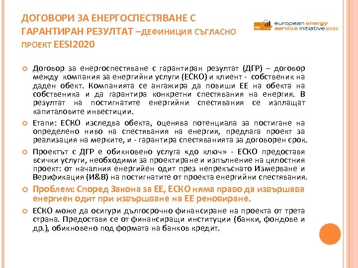 ДОГОВОРИ ЗА ЕНЕРГОСПЕСТЯВАНЕ С ГАРАНТИРАН РЕЗУЛТАТ –ДЕФИНИЦИЯ СЪГЛАСНО ПРОЕКТ ЕЕSI 2020 Договор за енергоспестяване с гарантиран резултат (ДГР) – договор между компания за енергийни услуги (EСКО) и клиент - собственик на даден обект. Компанията се ангажира да повиши ЕЕ на обекта на собственика и да гарантира конкретни спестявания на енергия. В резултат на постигнатите енергийни спестявания се изплащат капиталовите инвестиции. Етапи: EСКО изследва обекта, оценява потенциала за постигане на определено ниво на спестявания на енергия, предлага проект за реализация на мерките, и - гарантира спестяванията за договорен срок. Проектът с ДГР е обикновено услуга «до ключ» - EСКО предоставя всички услуги, необходими за проектиране и изпълнение на цялостния проект: от началния енергийен одит през непрекъснато Измерване и Верификация (И&В) на постигнатите от проекта енергийни спестявания. Проблем: Според Закона за ЕЕ, EСКО няма право да извършава енергиен одит при извършване на ЕЕ реновиране. EСКО може да осигури дългосрочно финансиране на проекта от трета страна. Предоставя се от финансиращи институции (банки, фондове и др. ), обикновено под формата на банков кредит.