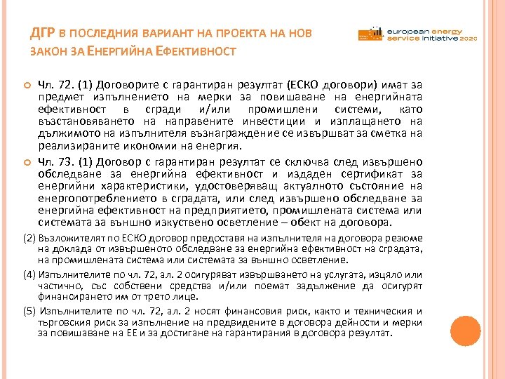 ДГР В ПОСЛЕДНИЯ ВАРИАНТ НА ПРОЕКТА НА НОВ ЗАКОН ЗА ЕНЕРГИЙНА ЕФЕКТИВНОСТ Чл. 72. (1) Договорите с гарантиран резултат (ЕСКО договори) имат за предмет изпълнението на мерки за повишаване на енергийната ефективност в сгради и/или промишлени системи, като възстановяването на направените инвестиции и изплащането на дължимото на изпълнителя възнаграждение се извършват за сметка на реализираните икономии на енергия. Чл. 73. (1) Договор с гарантиран резултат се сключва след извършено обследване за енергийна ефективност и издаден сертификат за енергийни характеристики, удостоверяващ актуалното състояние на енергопотреблението в сградата, или след извършено обследване за енергийна ефективност на предприятието, промишлената система или системата за външно изкуствено осветление – обект на договора. (2) Възложителят по ЕСКО договор предоставя на изпълнителя на договора резюме на доклада от извършеното обследване за енергийна ефективност на сградата, на промишлената система или системата за външно осветление. (4) Изпълнителите по чл. 72, ал. 2 осигуряват извършването на услугата, изцяло или частично, със собствени средства и/или поемат задължение да осигурят финансирането им от трето лице. (5) Изпълнителите по чл. 72, ал. 2 носят финансовия риск, както и техническия и търговския риск за изпълнение на предвидените в договора дейности и мерки за повишаване на EE и за достигане на гарантирания в договора резултат.
