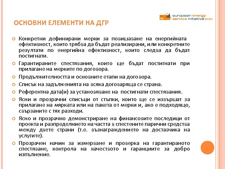 ОСНОВНИ ЕЛЕМЕНТИ НА ДГР Конкретни дефинирани мерки за повишаване на енергийната ефективност, които трябва да бъдат реализирани, или конкретните резултати по енергийна ефективност, които следва да бъдат постигнати. Гарантираните спестявания, които ще бъдат постигнати прилагане на мерките по договора. Продължителността и основните етапи на договора. Списък на задълженията на всяка договаряща се страна. Референтна дата(и) за установяване на постигнати спестявания. Ясни и прозрачни списъци от стъпки, които ще се извършат за прилагане на мярката или на пакета от мерки и, ако е подходящо, свързаните с тях разходи. Ясно и прозрачно демонстриране на финансовите последици от проекта и разпределнието на частта в спестените парични средства между двете страни (т. е. възнаграждението на доставчика на услугите). Прозрачен начин за измерване и проверка на гарантираното спестяване, контролa на качеството и гаранциите за добро изпълнение.