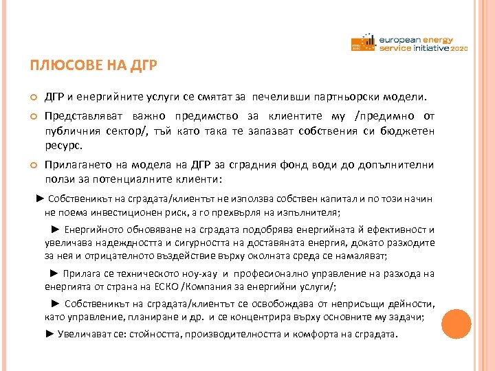 ПЛЮСОВЕ НА ДГР и енергийните услуги се смятат за печеливши партньорски модели. Представляват важно предимство за клиентите му /предимно от публичния сектор/, тъй като така те запазват собствения си бюджетен ресурс. Прилагането на модела на ДГР за сградния фонд води до допълнителни ползи за потенциалните клиенти: ► Собственикът на сградата/клиентът не използва собствен капитал и по този начин не поема инвестиционен риск, а го прехвърля на изпълнителя; ► Енергийното обновяване на сградата подобрява енергийната й ефективност и увеличава надеждността и сигурността на доставяната енергия, докато разходите за нея и отрицателното въздействие върху околната среда се намаляват; ► Прилага се техническото ноу-хау и професионално управление на разхода на енергията от страна на ЕСКО /Компания за енергийни услуги/; ► Собственикът на сградата/клиентът се освобождава от неприсъщи дейности, като управление, планиране и др. и се концентрира върху основните му задачи; ► Увеличават се: стойността, производителността и комфорта на сградата.