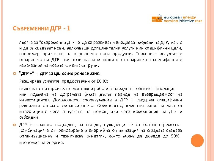 СЪВРЕМЕННИ ДГР - 1 Идеята за "съвременни ДГР" е да се развиват и внедряват модели на ДГР, както и да се създават нови, включващи допълнителни услуги или специфични цели, например прилагане на качествено нови продукти. Търсеният резултат е отварянето на ДГР към нови пазарни ниши и отговаряне на специфичните изисквания на новите клиентски групи. "ДГР +" = ДГР за цялостно реновиране: Разширява услугите, предоставяни от ЕСКО: включване на строително монтажни работи за сградната обвивка - изолация или подмяна на дограмата (имат дълъг период на възвръщаемост на инвестициите). Договорното споразумение в ДГР + съдържа специфични реквизити относно финансирането. Обикновено, клиентът заплаща част от инвестициите чрез отпускане на помощ или чрез комбинация на ДГР и субсидии. ДГР + - много подходящ за сгради, нуждаещи се от основен ремонт. Комбинацията от реновиране и енергийна оптимизация на сградата създава организационна и техническа синергия, която може да доведе до 50% икономия на енергия.