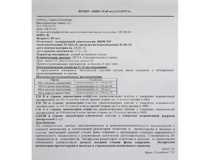 • При подтверждении данных иммунногистохимического исследования PR, ER свидетельствующих о поражении рецепторов эндометрия, целесообразно применение препаратов, обладающих высокой энергией связывания с эстрогеновыми и прогестероновыми рецепторами (дидрогестерона)