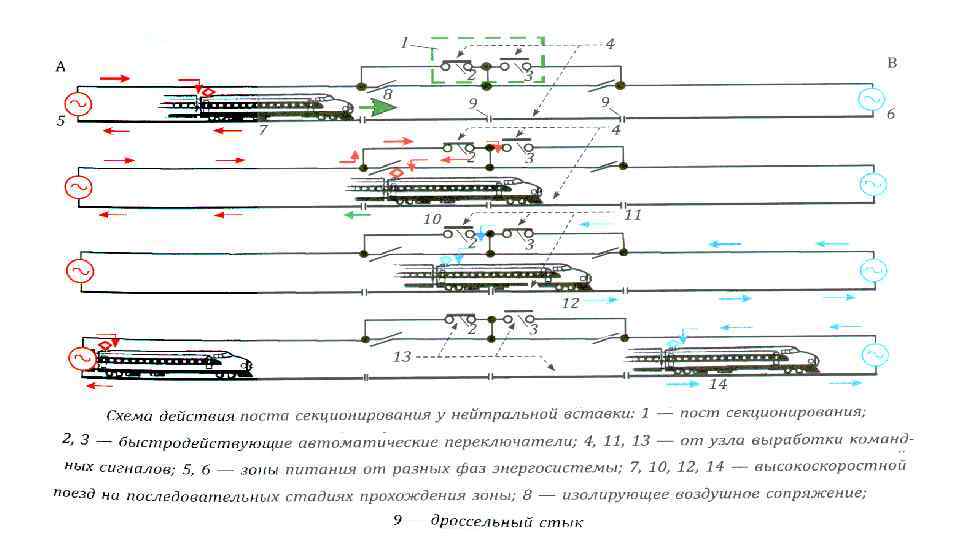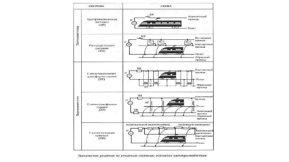 Способы усиления тягового электроснабжения Основными способами усиления тягового электроснабжения являются: – повышение уровня напряжения в электротяговой сети путём перевода электрифицированной линии на систему электрической тяге однофазного тока напряжением 25 к. В; – в перспективе повышением уровня напряжения в контактной сети постоянного тока до 18 – 24 к. В и созданием электроподвижного состава постоянного тока высокого напряжения; – применение системы распределённого питания электротяговой сети с продольными линиями высокого напряжения на переменном токе - система 2× 25 к. В с автотрансформаторными пунктами; -применение коаксиального кабеля; - система с линейными преобразовательными пунктами питания контактной сети от продольной высоковольтной линии электропередач; При усилении тягового электроснабжение также используется: - автоматическое поддержания напряжения у токоприемников за счёт регулирования напряжения на шинах тяговых подстанций; - монтаж усиливающих проводов контактной подвески и увеличение сечения контактных проводов; - применение схем питания контактной сети постом секционирования и пунктами параллельного соединения контактных подвесок обоих путей; – сооружение на межподстанционных зонах дополнительных тяговых подстанций или пунктов питания; – увеличение мощности тяговых подстанций и уменьшение длины межподстанционных зон; – усиление внешнего электроснабжения и ограничение отклонений уровня напряжения на вводах тяговых подстанций. Эффект от применения отдельных мероприятий различен и, как правило, является недостаточным. Усиление тягового электроснабжения конкретной линии для достижения требуемых показателей качества электроснабжение высокоскоростных поездов выполняется при комплексном применение мер. Наряду с техническими мероприятиями, снижение потерь напряжения в тяговой сети может быть достигнута за счёт рациональной организации движения. Например, введение пакетного графика движения скоростных поездов с интервалами между ними, равными временами хода по наиболее длинному участку между тяговыми подстанциями, что обеспечивает нахождения на каждой межподстанционной зоне только одного поезда.