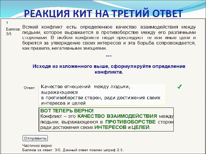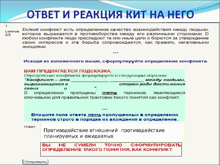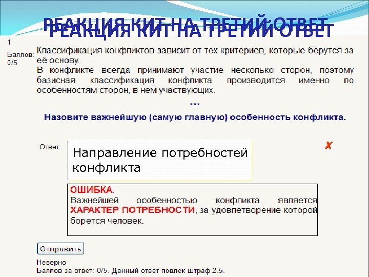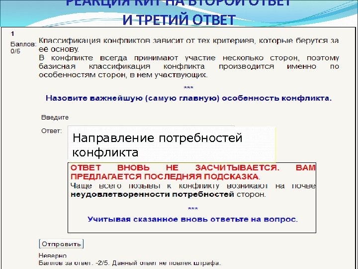 РЕАКЦИЯ КИТ НА ОТВЕТ И ВТОРОЙ ОТВЕТ Направление конфликта Это предмет конфликта